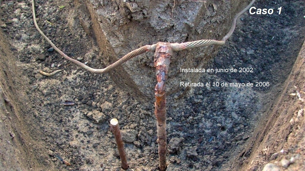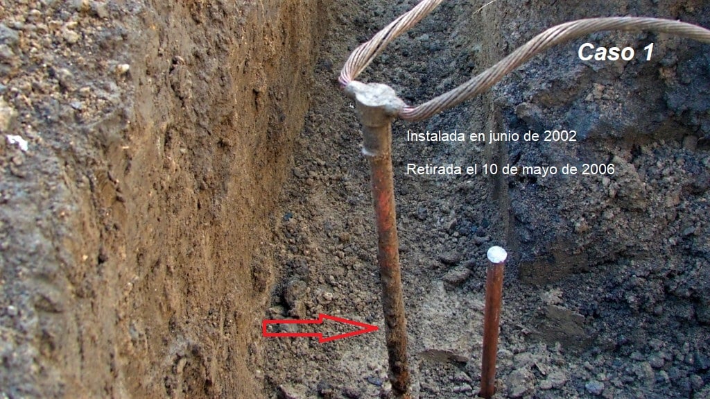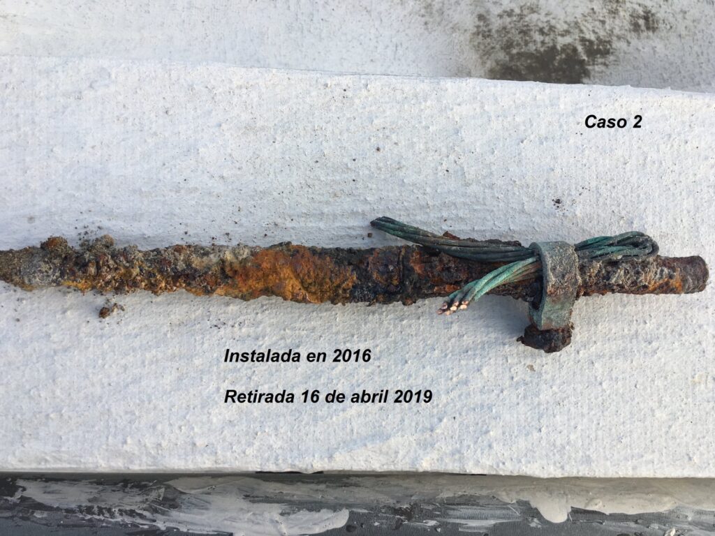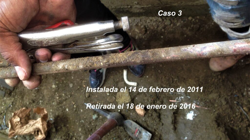 Periodos de los electrodos: Caso 1, (4 años), Caso 2 (3 años) y Caso 3 (5 año). El Caso 3 aun con 5 años de enterramiento presenta poca corrosión, pues, es certificado UL 467.