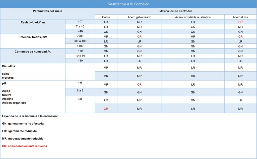 La tabla muestra la resistencia a la corrosión de los materiales de los electrodos de acuerdo con los parámetros del suelo. Esa información ofrece una idea de qué tipo de material de electrodo se debe escoger.